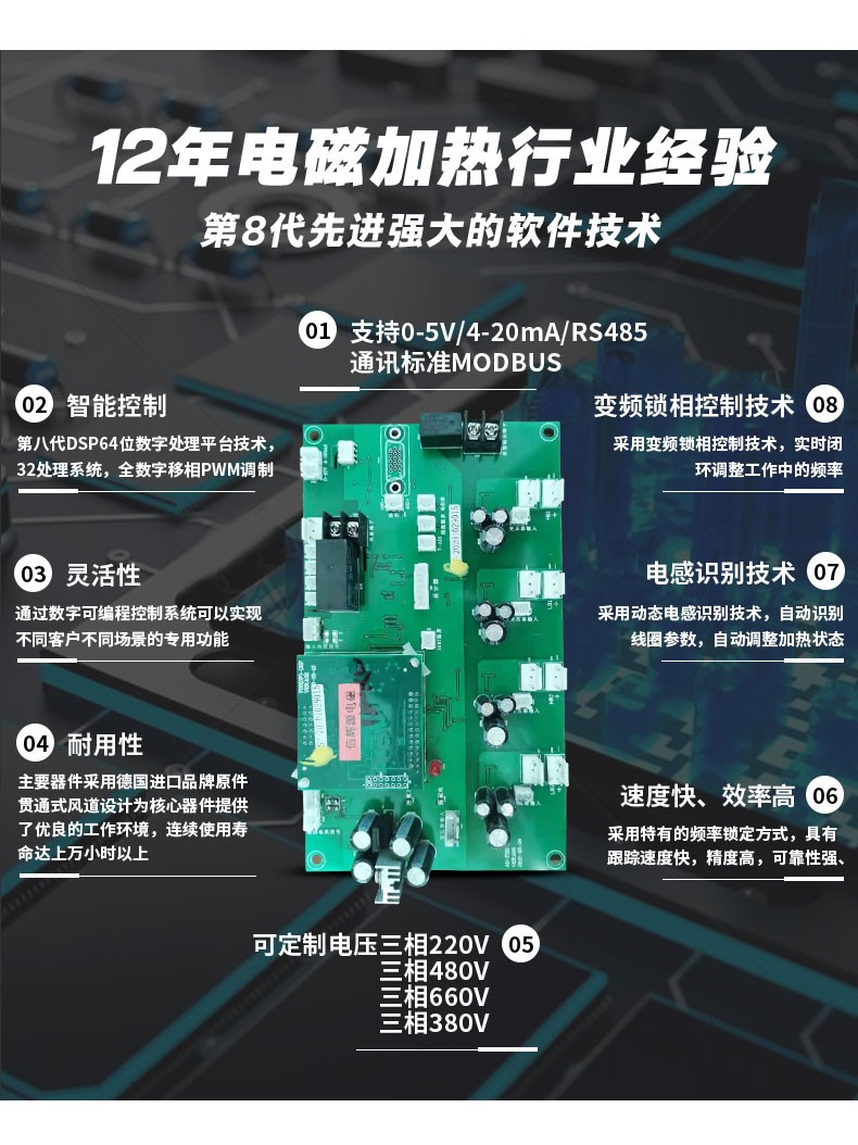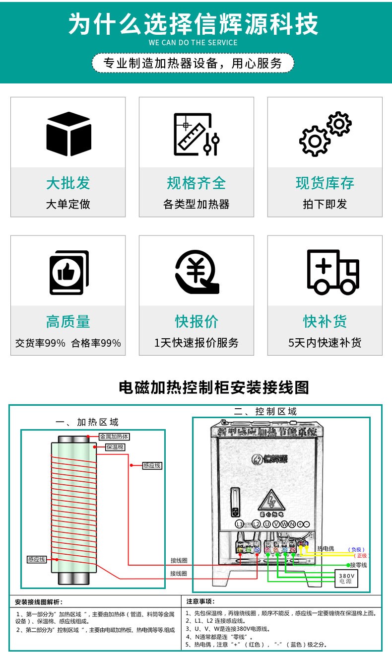 40KW电磁加热器磁加热系统由两部分组成:电磁控制器和加热圈。原机受温度控制的电源(加热输出接触器(或固态继电器)输出端)经电磁控制器将工频交流电整流、滤波、逆变成20—50KHZ的高频高压电,通过连接线接到电磁加热圈上,高频交流电透过保温材料作用于料筒,使料筒本身发热。另外,也可以把电源直接输入到电磁控制器,原有的温度控制器直接用来控制电磁控制器。